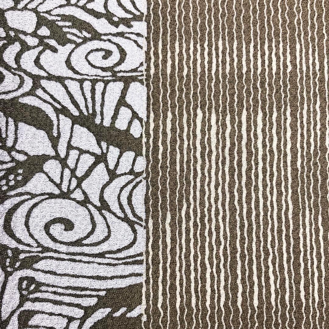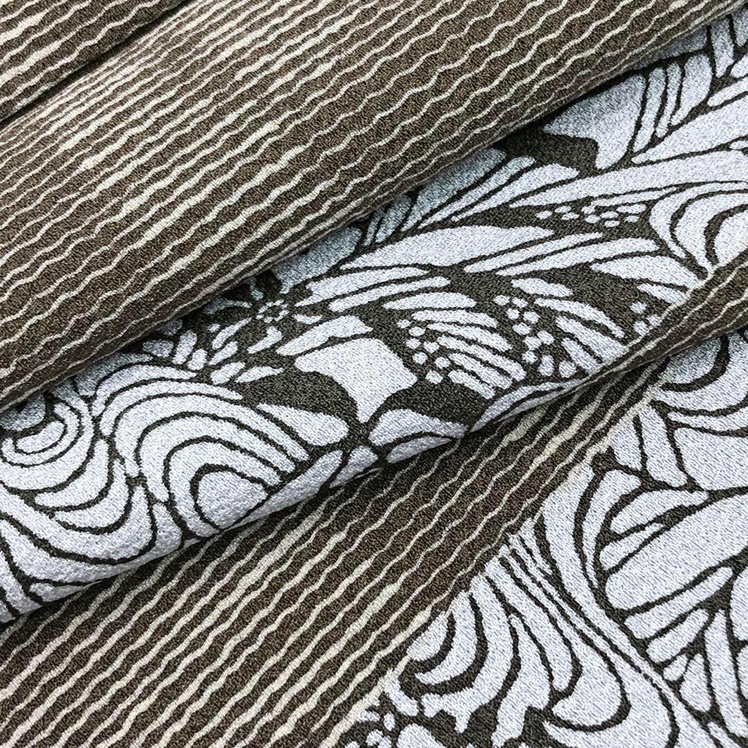 枯色ベースの縮緬に型染の縦柄花模様、霞模様の柄裄がデザインされた雰囲気の良い素敵な柄行のお品でございます。