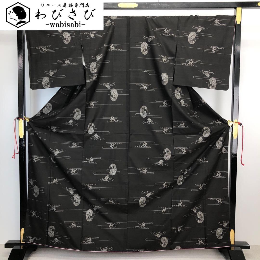 泥染の雰囲気の良い黒地に兎と亀、霞模様がデザインされた素敵な柄裄のお品でございます。