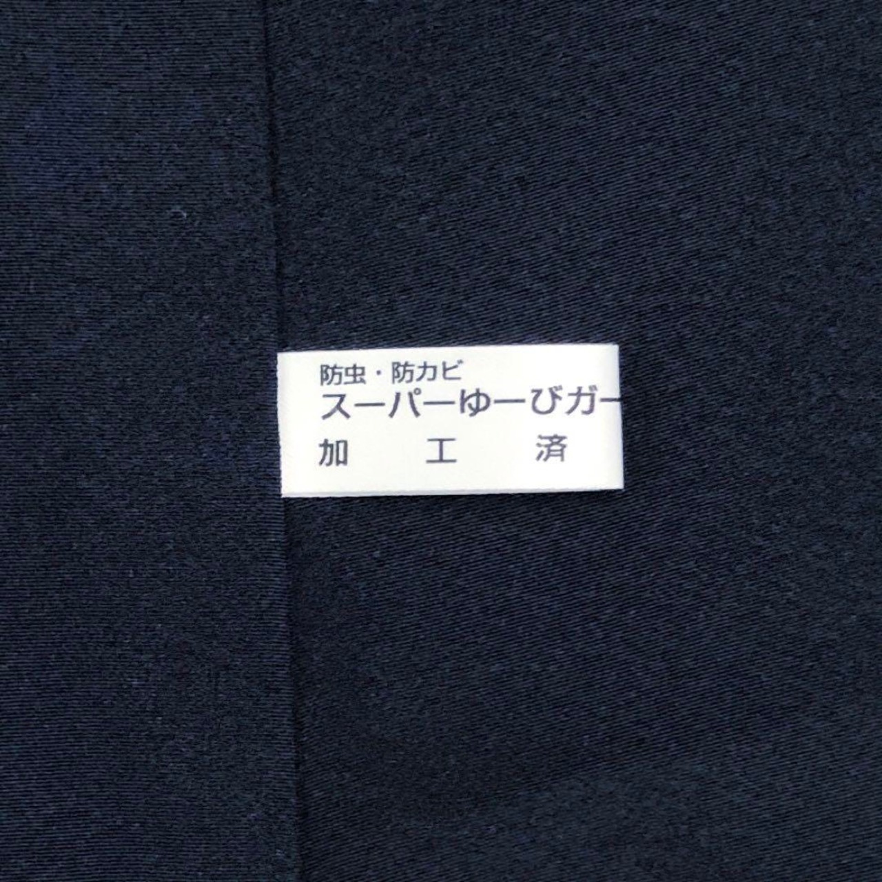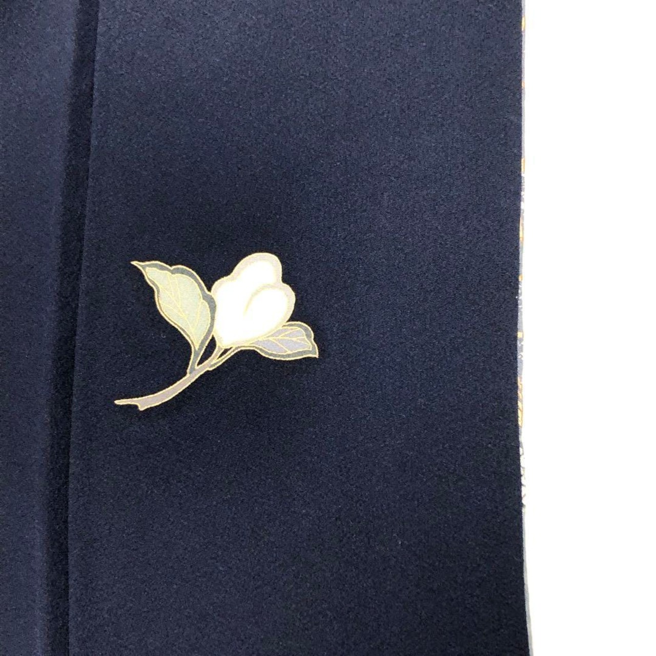 印度藍色の落ち着きあるお色味の縮緬に暈し、金駒刺繍、金彩などが使われた椿と梅の花模様の染柄がデザインされた素敵な柄裄のお品でございます。