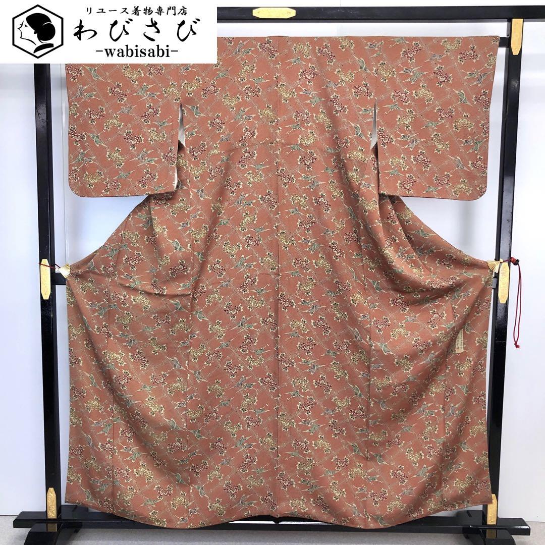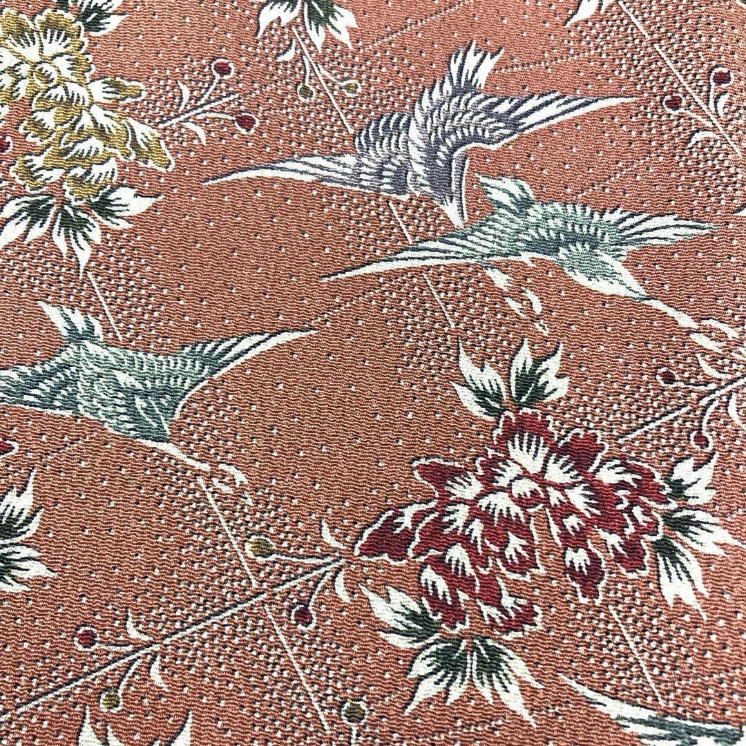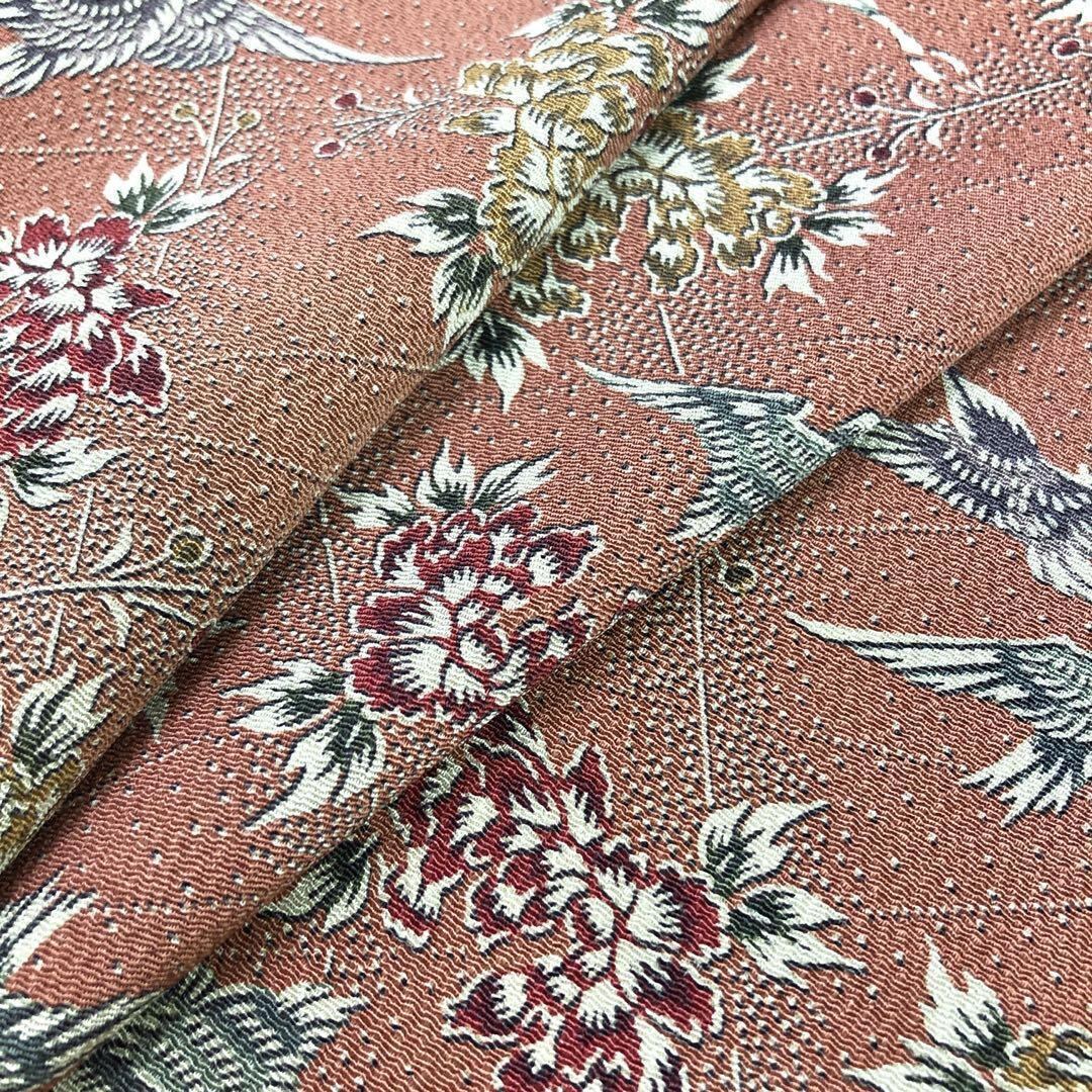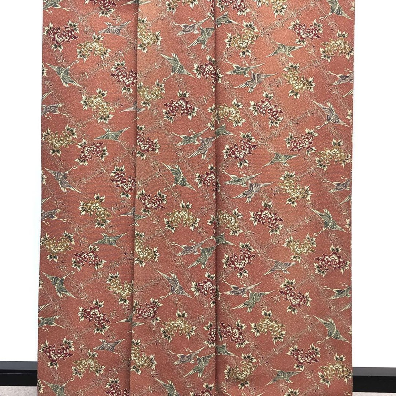 弁柄色の縮緬に斜め格子柄、鳥に花模様の雰囲気の良い柄行がデザインされた素敵なお品でございます。