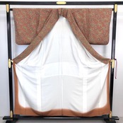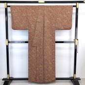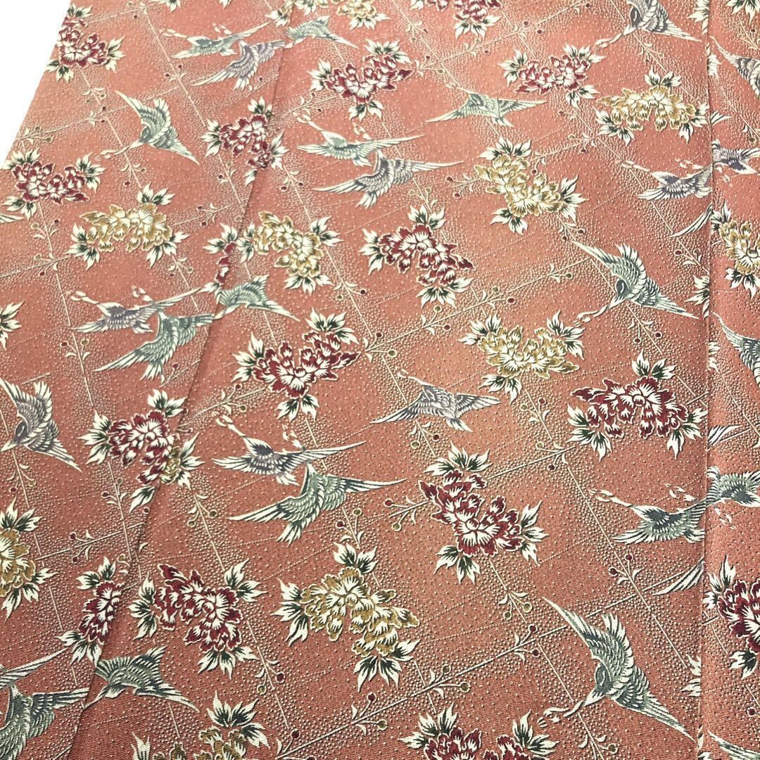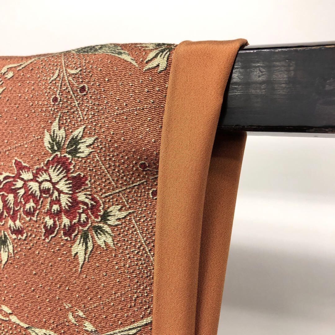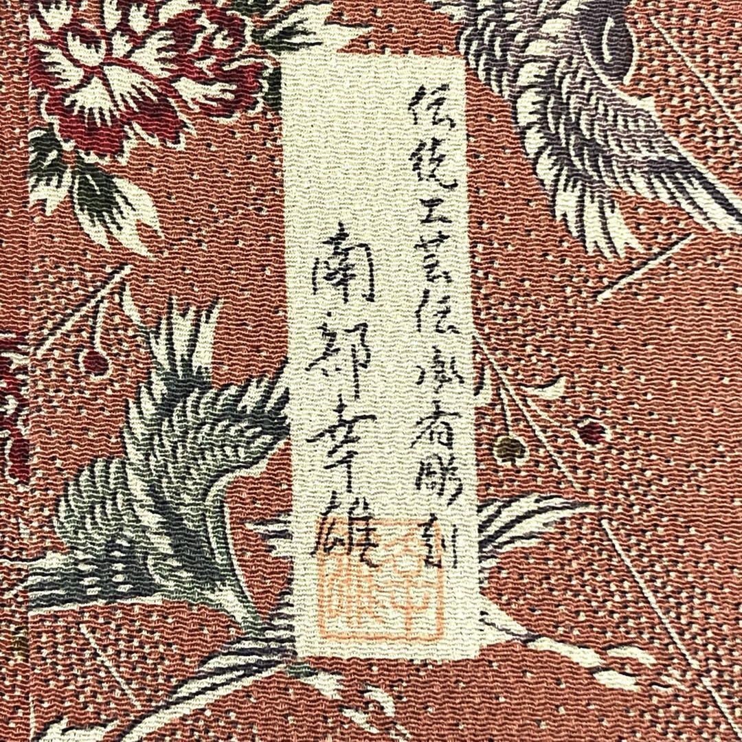 弁柄色の縮緬に斜め格子柄、鳥に花模様の雰囲気の良い柄行がデザインされた素敵なお品でございます。