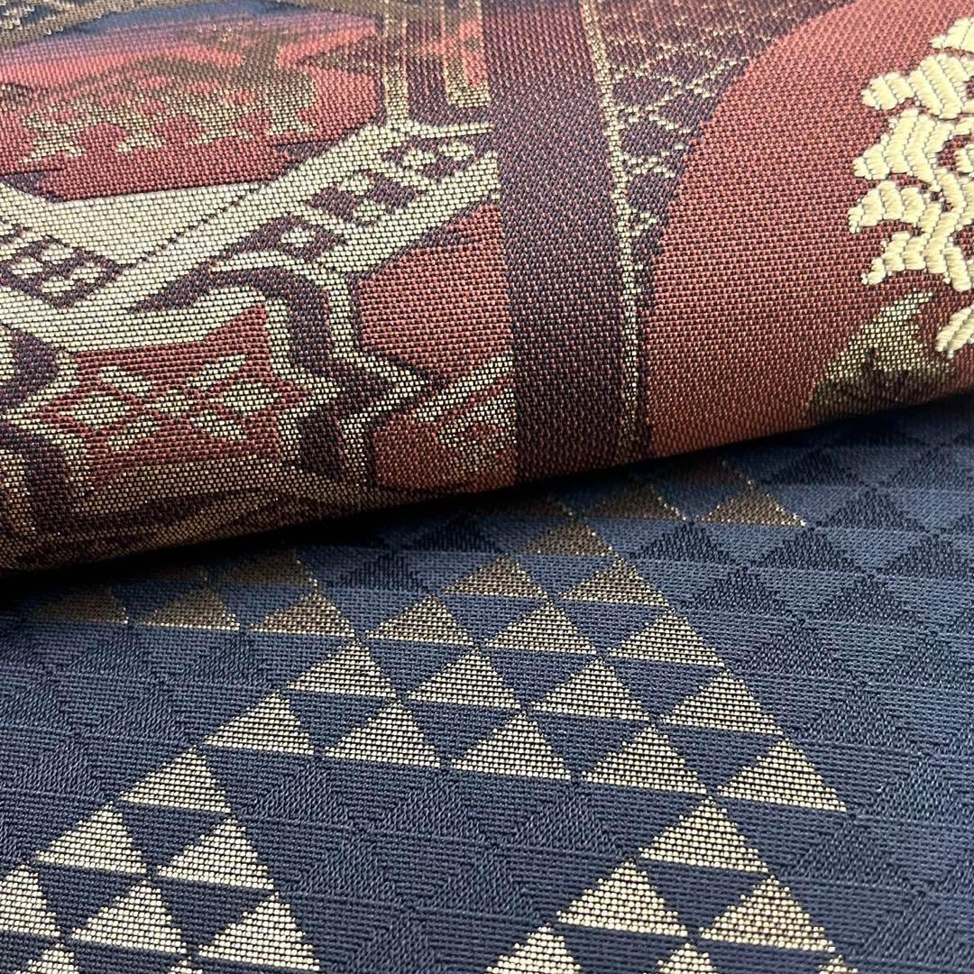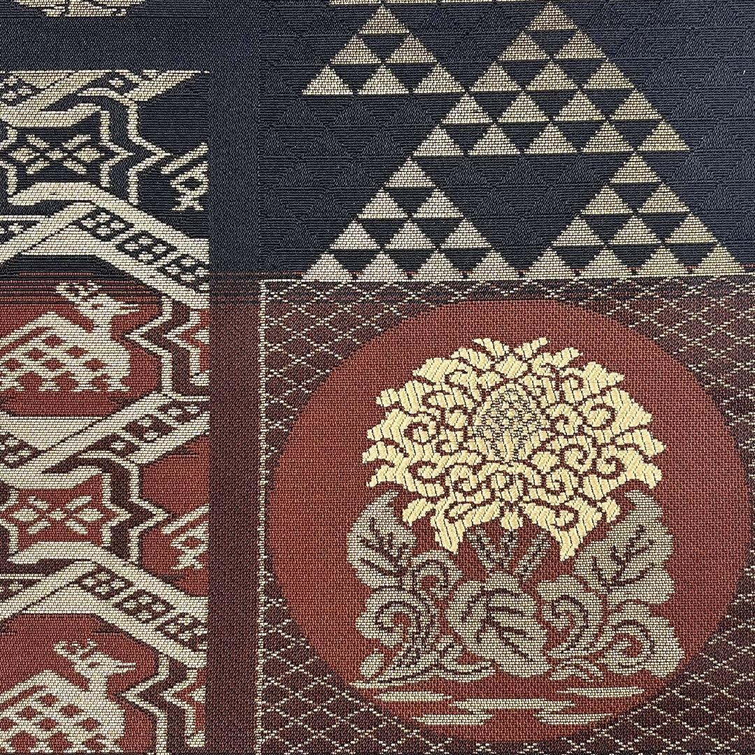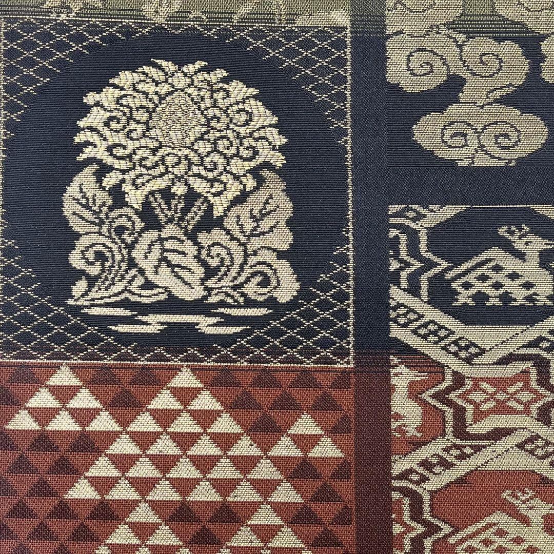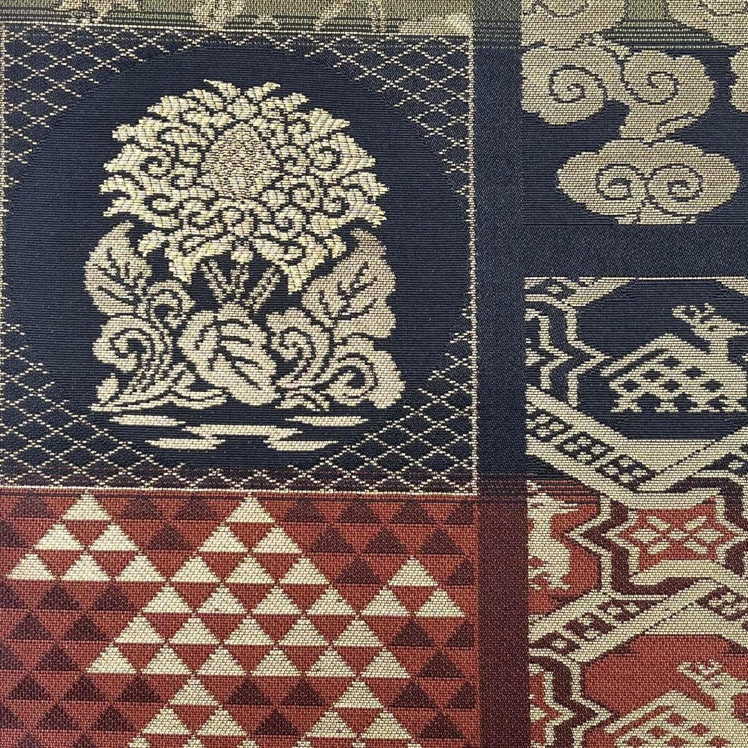 紺鉄色ベースのお色味に金糸が使われた有栖川、花唐草花柄模様などがデザインされた素敵なお品でございます。