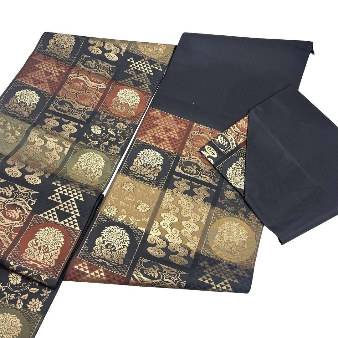 名古屋帯 有栖川 花唐草 花柄模様 金糸 紺鉄色 O-4708 着物 きもの kimono 和服 和装 中古 リサイクル着物 【送料無料】