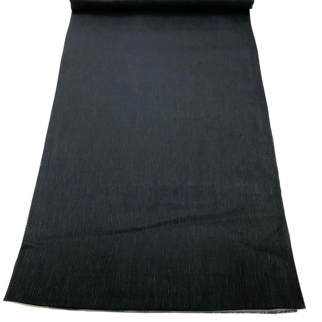 江戸納戸色ベースのお色味に抽象花模様、縦縞模様などの柄裄がデザインされた雰囲気の良い素敵なお品でございます。
