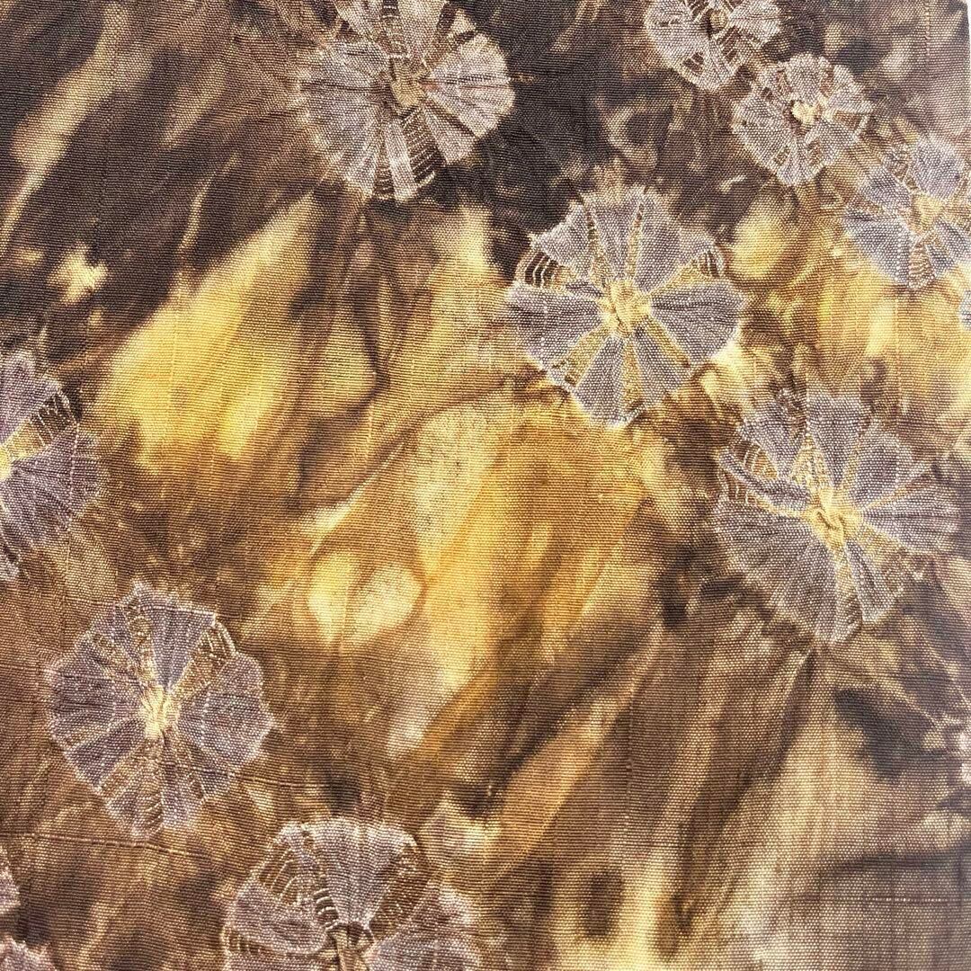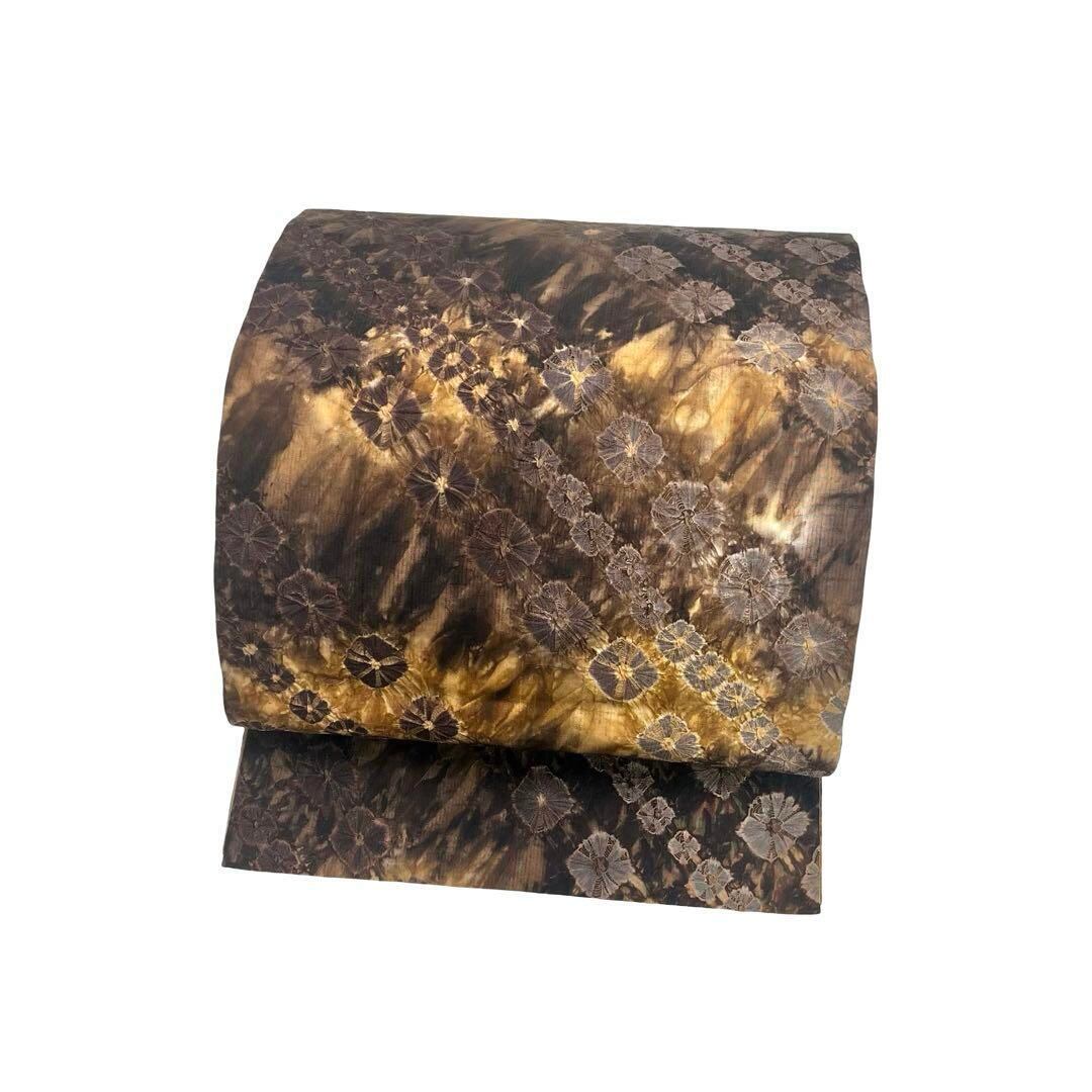 琥珀色ベースの雰囲気の良い色彩、蜘蛛絞りの斜めの絞り柄がデザインされた素敵な柄裄のお品でございます。
