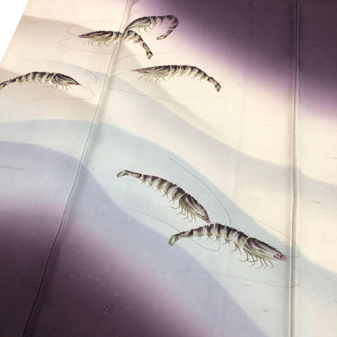 紫鳥色ベースの落ち着きのある紫味の紬地に淡い色彩の波模様のような暈し染、海老柄がデザインされた素敵な柄裄のお品でございます。