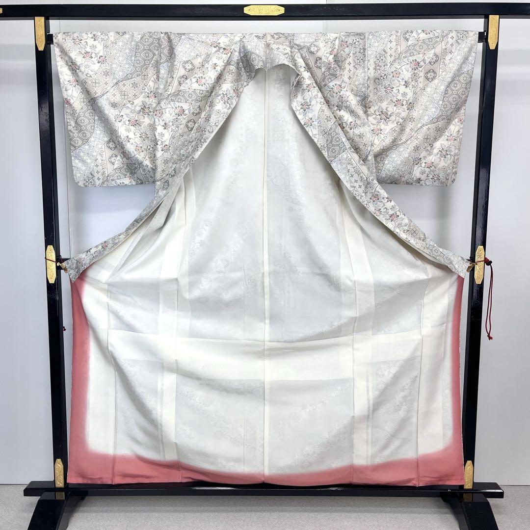 上品な白泥染のお色味、道長取りに花柄模様、花唐草がデザインされた素敵な柄裄のお品でございます。