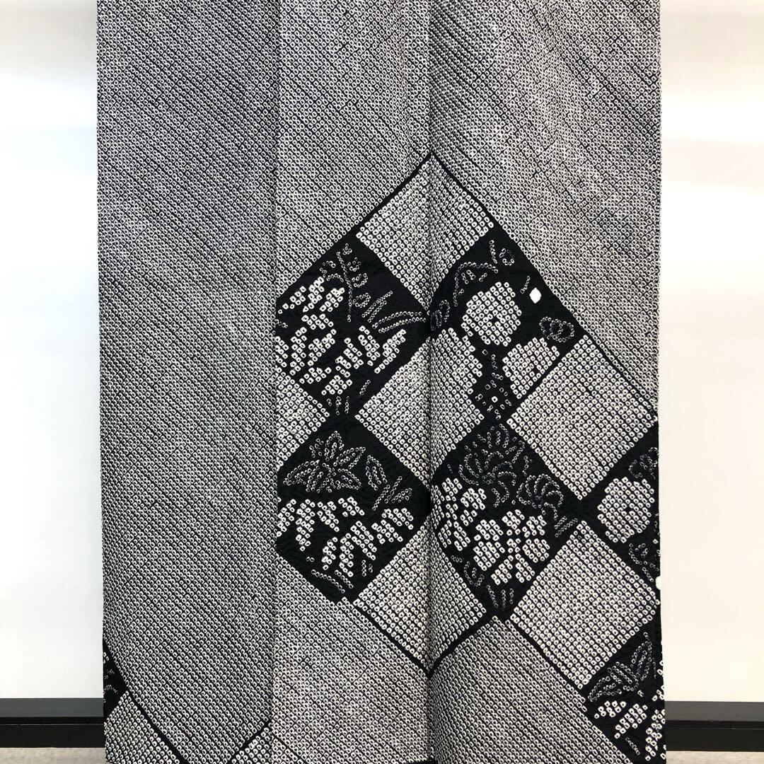 訪問着 総絞り 疋田絞り 四角に花模様 黒色 K-4405 着物 きもの kimono 和服 和装 中古 リサイクル着物 【送料無料】