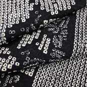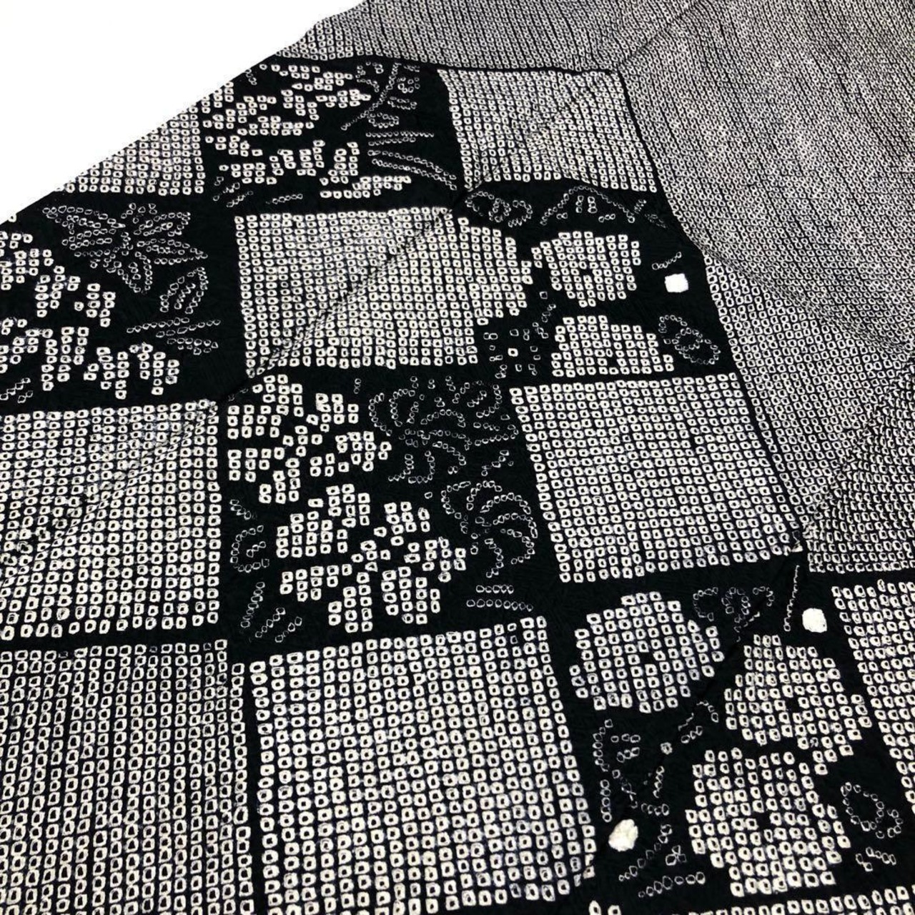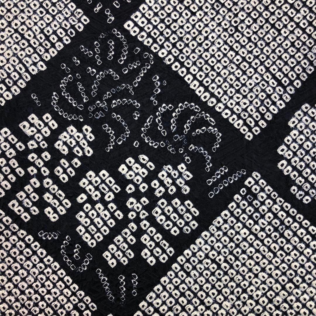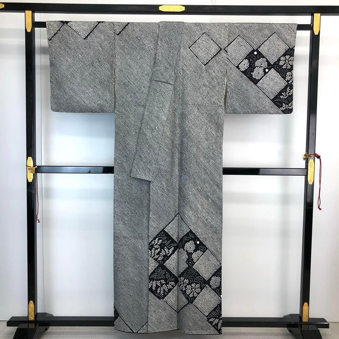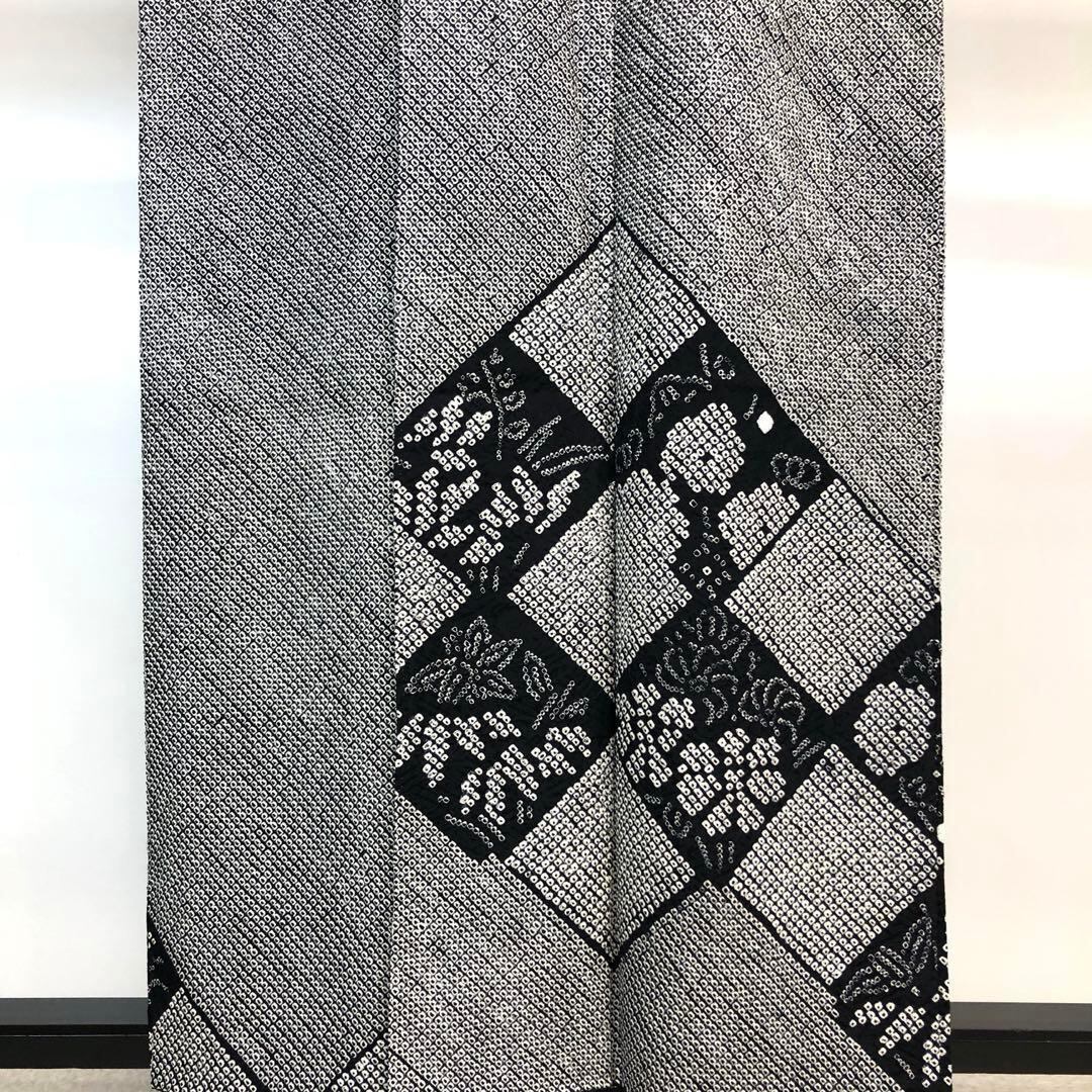 モノトーンベース、黒色のお色味に四角に花模様の柄裄がデザインされた素敵なお品でございます。
