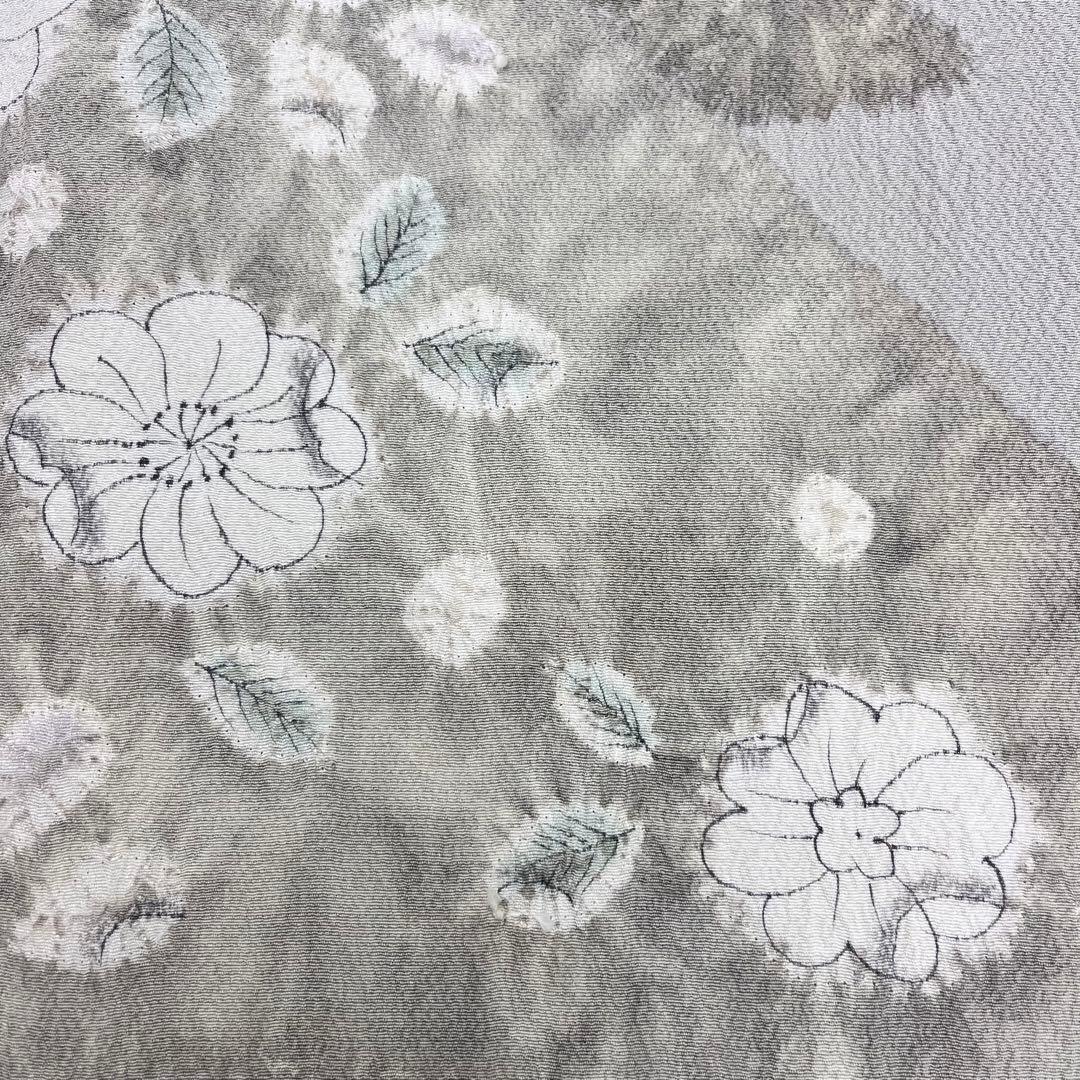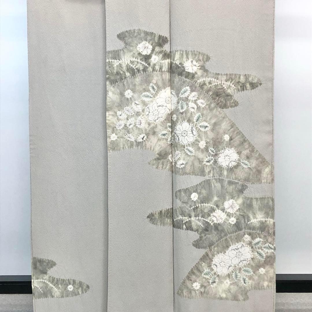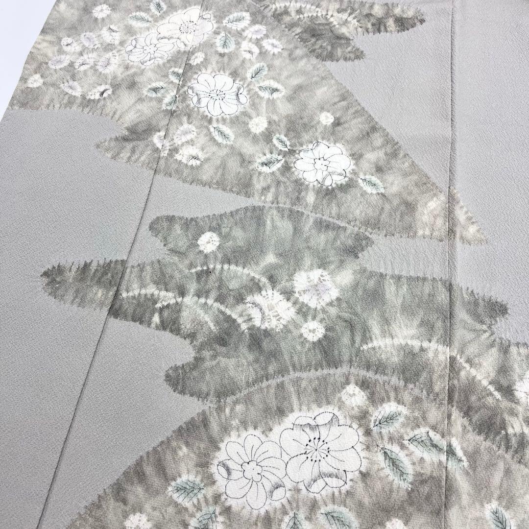 灰白色の品のある縮緬地に上品な辻が花絞りの柄裄がデザインされた素敵なお品でございます。