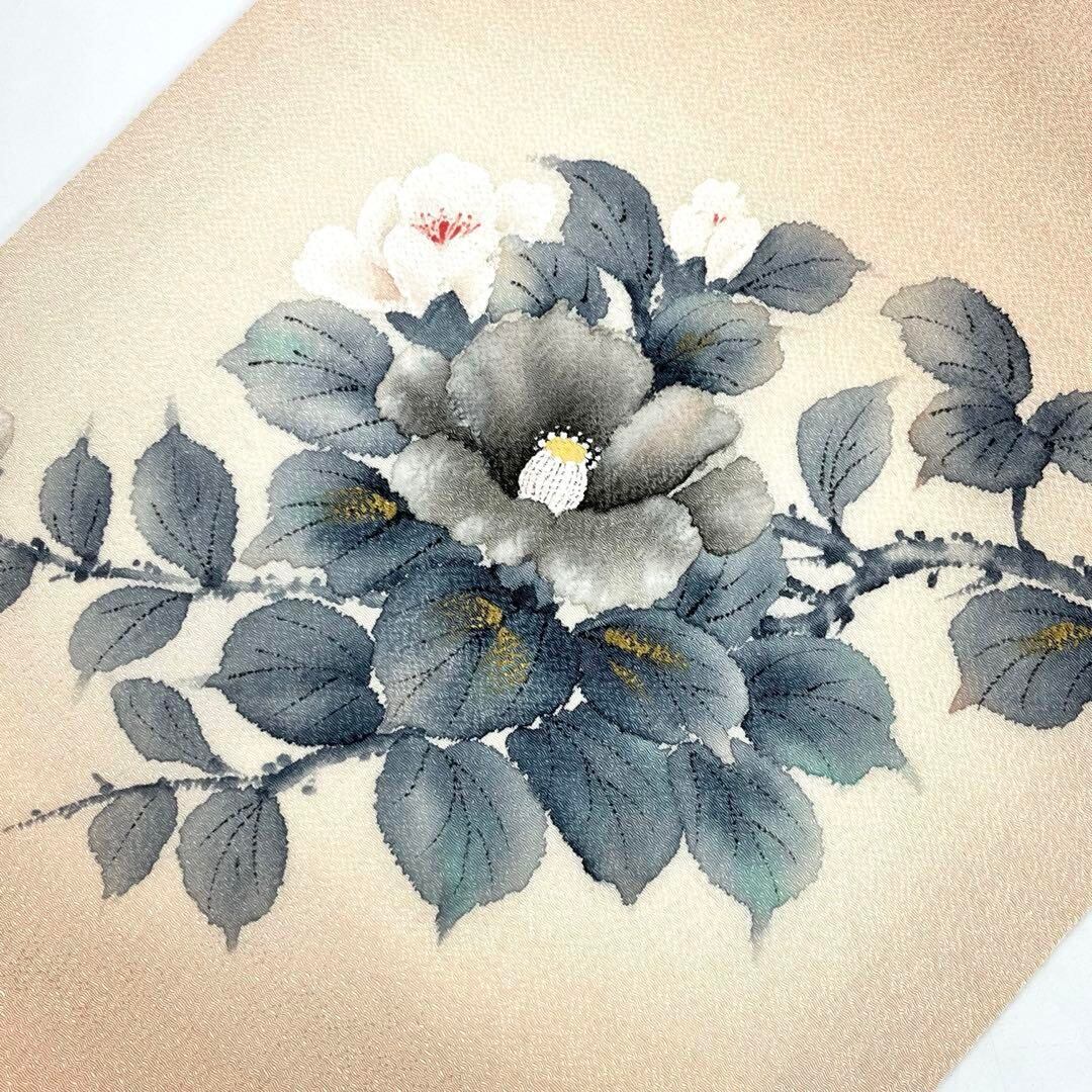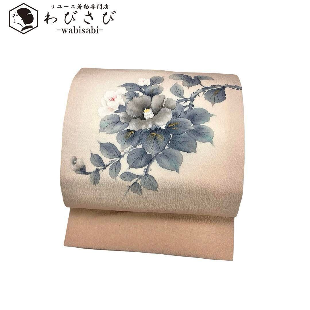 名古屋帯 作家物 手描き 花模様 薄赤色 縮緬 O-4714 着物 きもの kimono 和服 和装 中古 リサイクル着物 【送料無料】