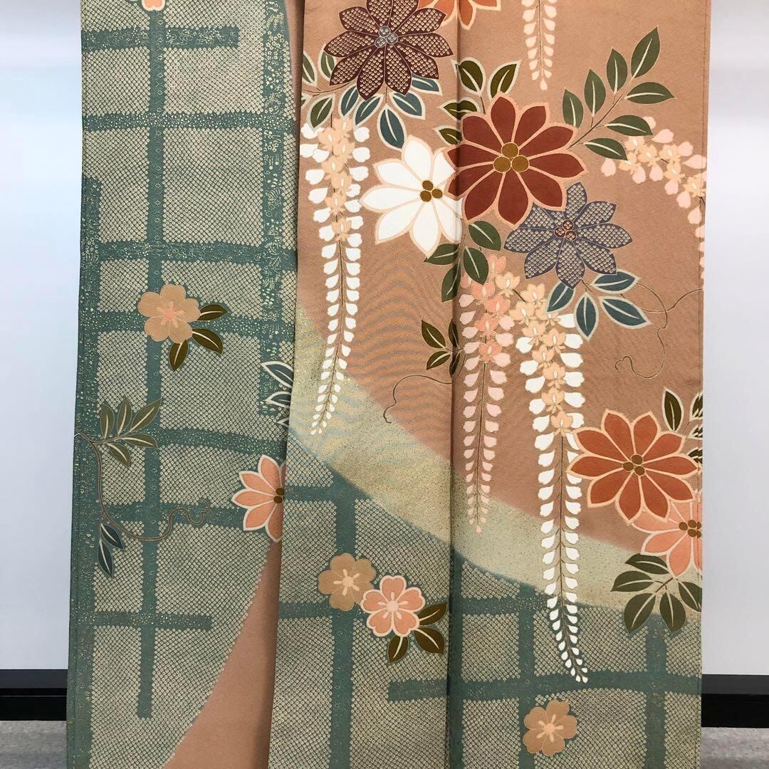 土器色のお色味の縮緬に雰囲気の良い花柄模様がデザインされた素敵なお品でございます。