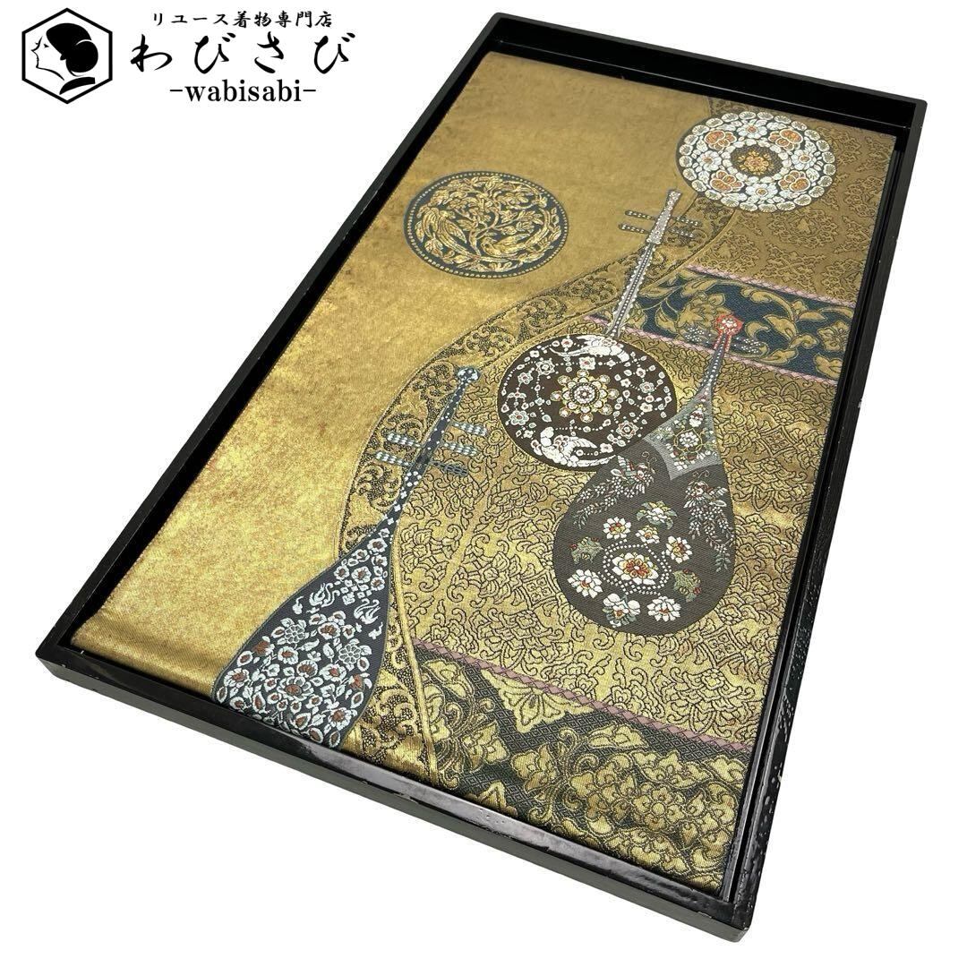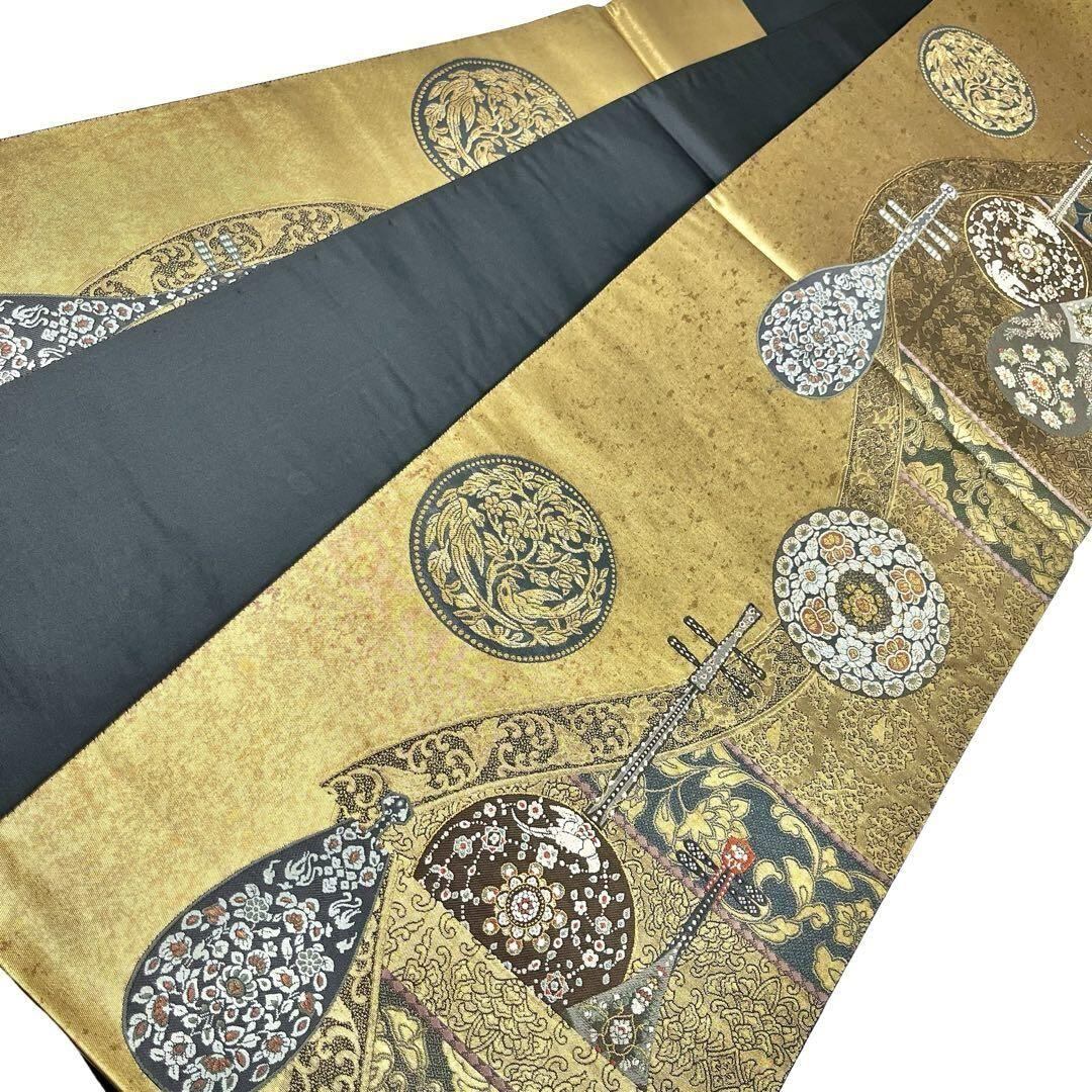 黄土色ベースの金色に楽器柄、丸に華柄模様、鳥などの柄行がデザインされた素敵なお品でございます。