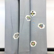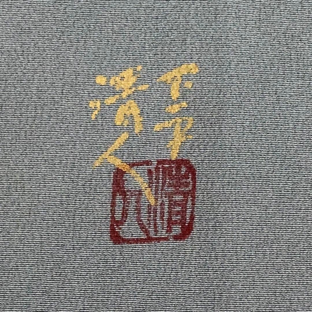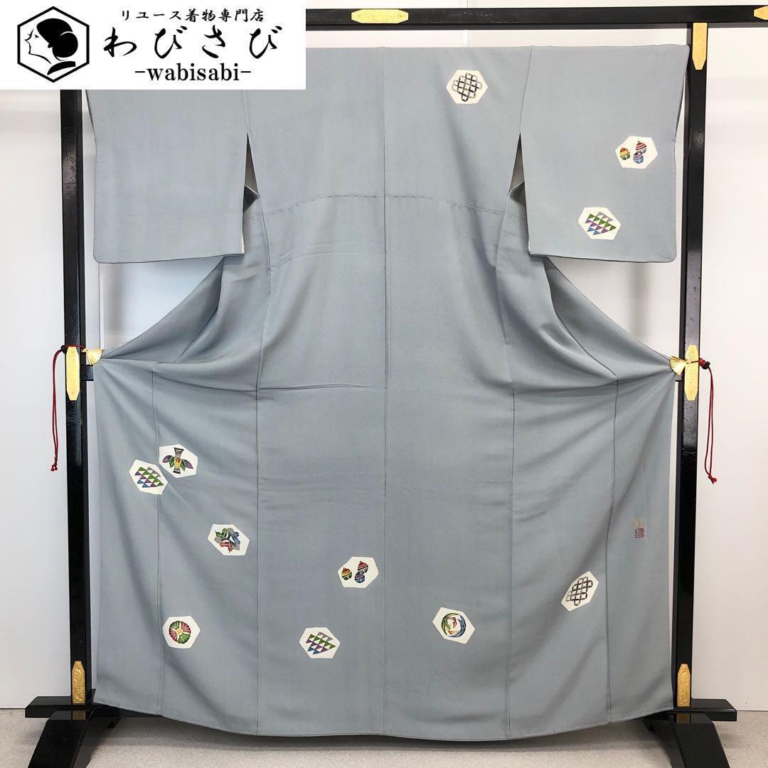 沈香茶色の縮緬地に六角に笹、鈴などの染め柄がデザインされた雰囲気の良い素敵なお品でございます。