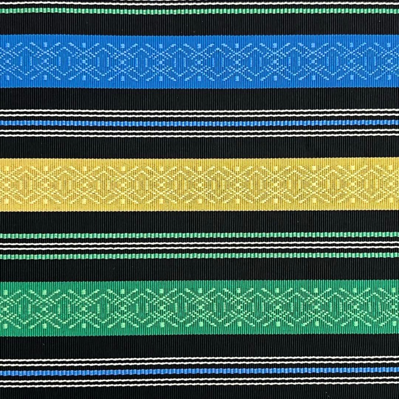 黒色に青、緑、黄色の三色の色彩の献上柄がデザインされた素敵な柄裄のお品でございます。