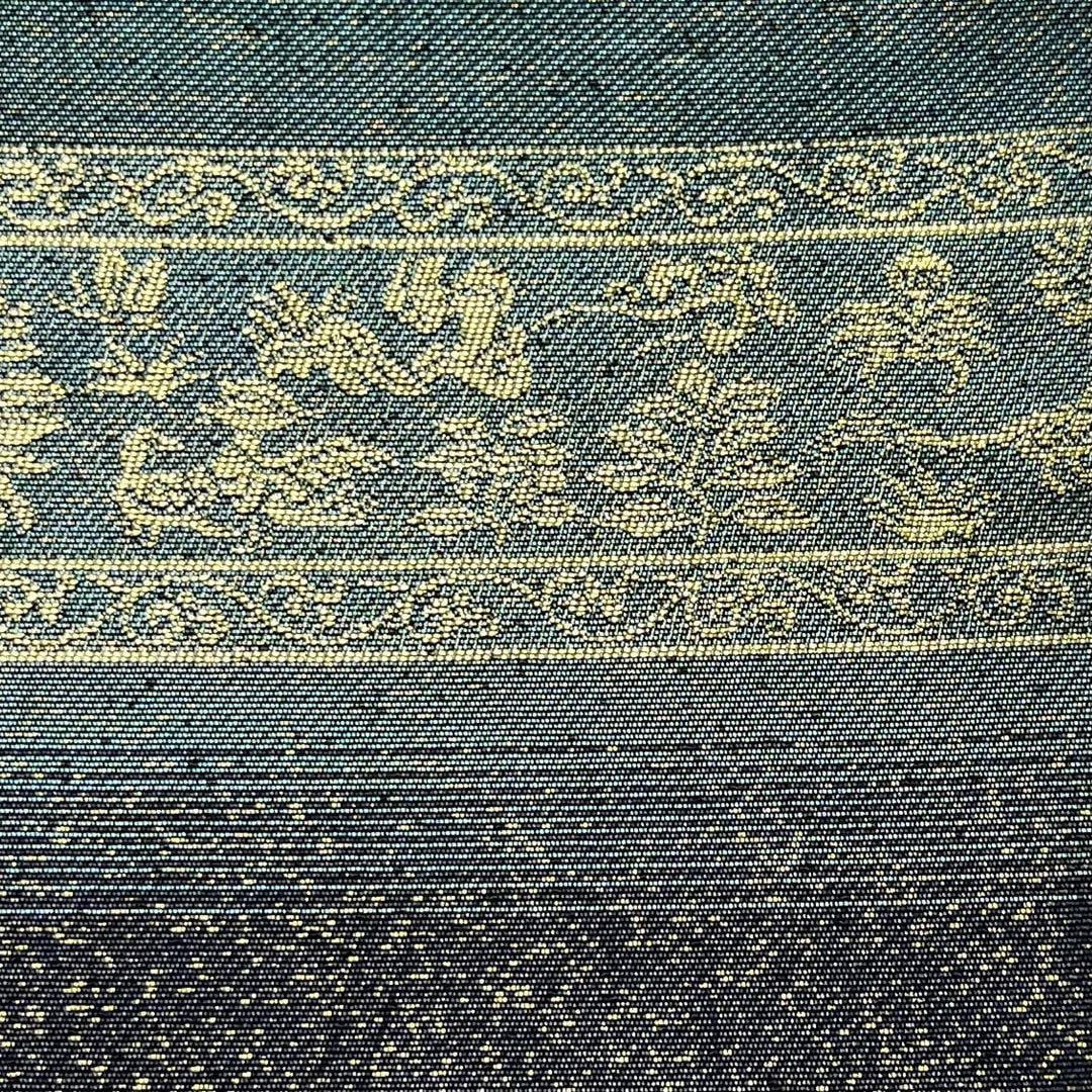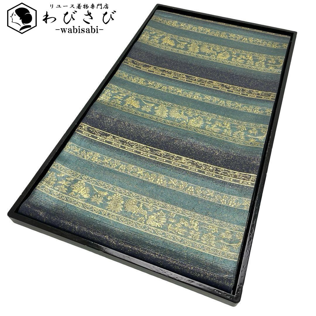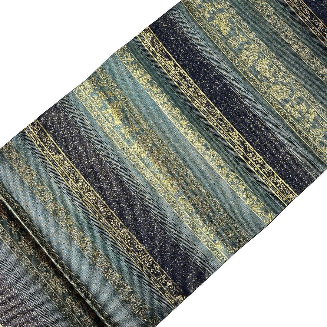 袋帯 横段花草模様 鳥 金糸 碧色 ガード加工 O-4723 着物 きもの kimono 和服 和装 中古 リサイクル着物 【送料無料】