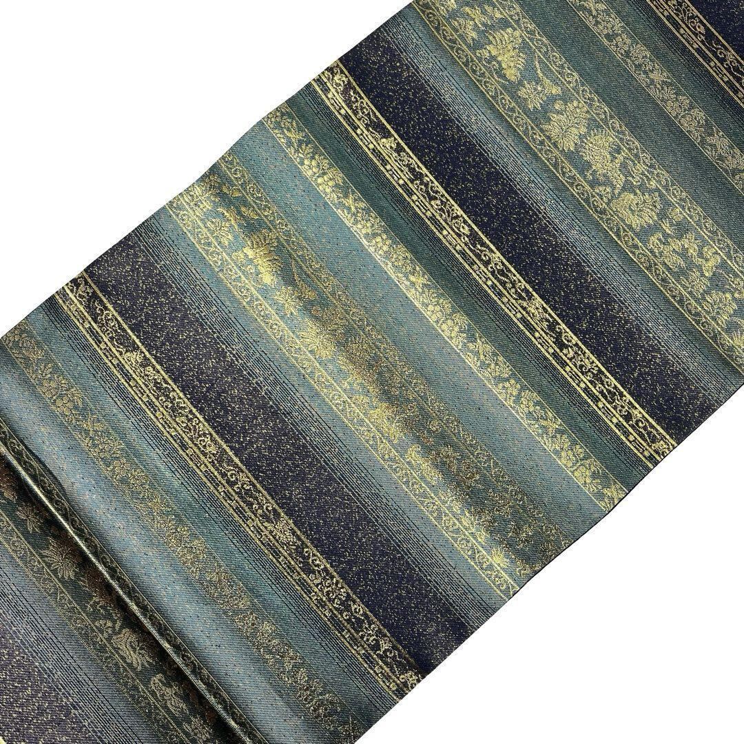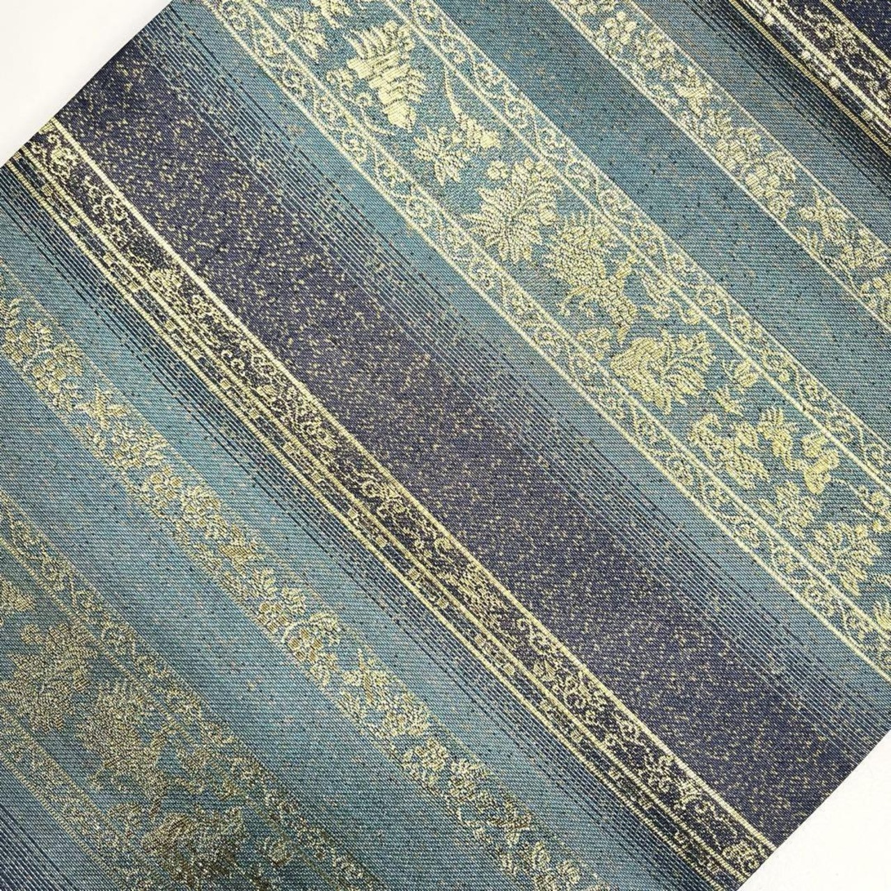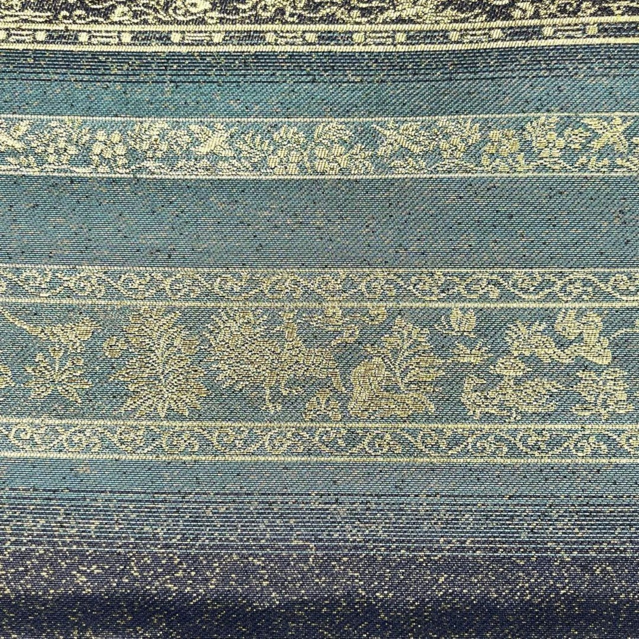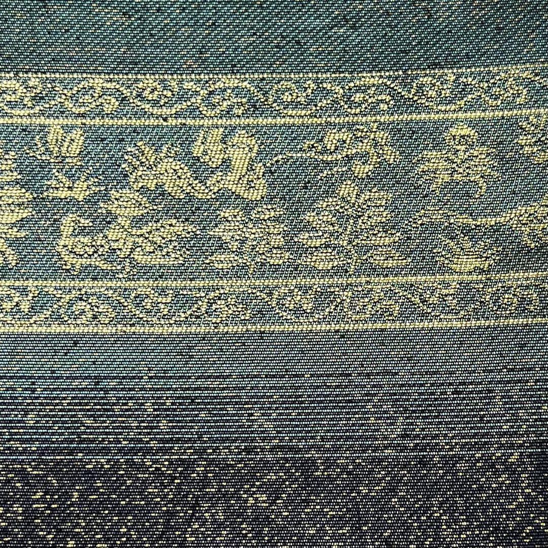 碧色ベースのお色味に金糸が使われた横段花草模様がデザインされた素敵な柄裄のお品でございます。