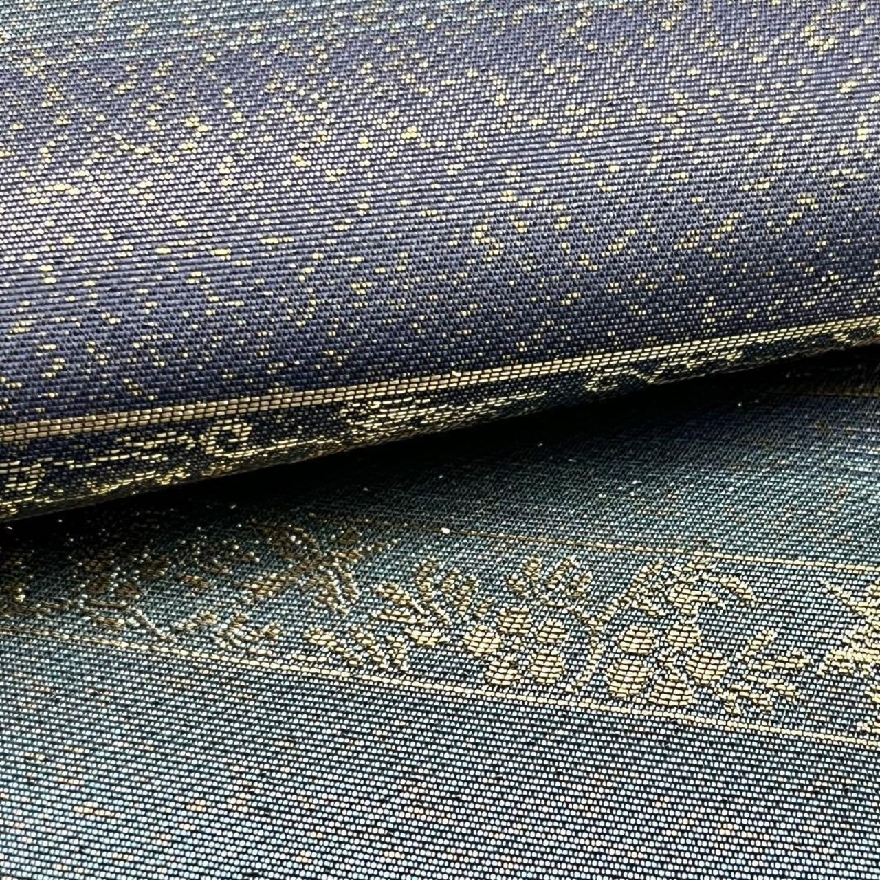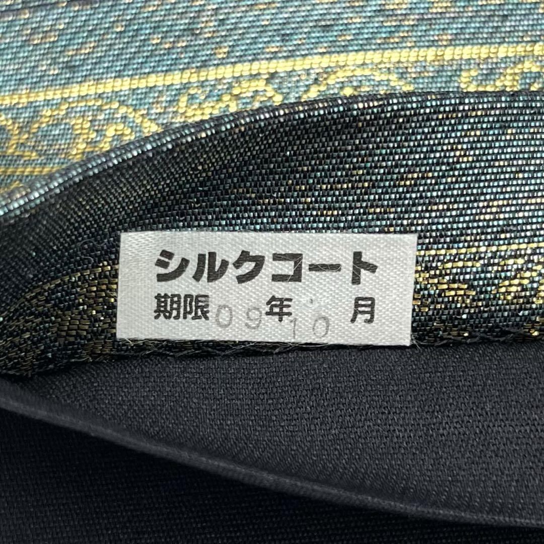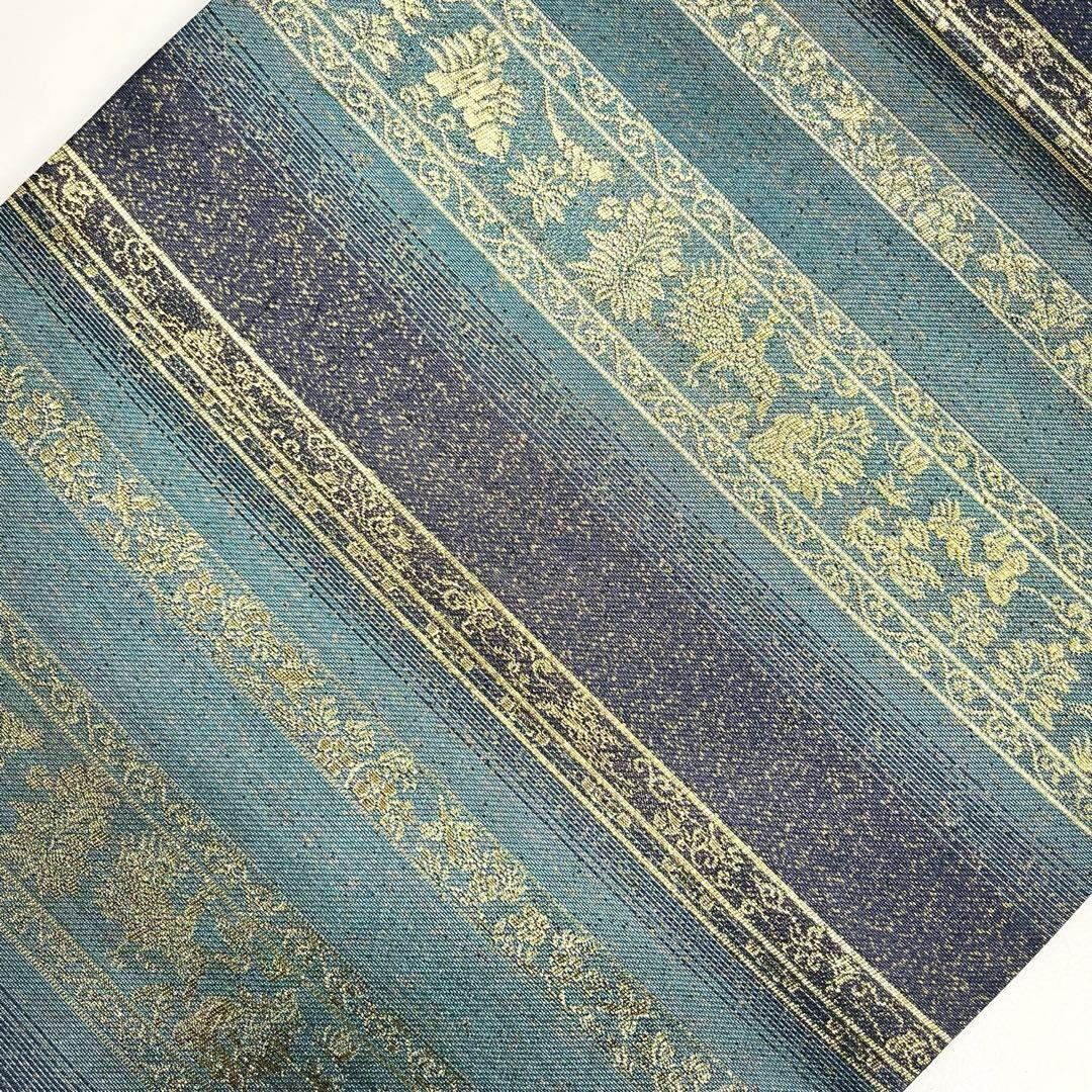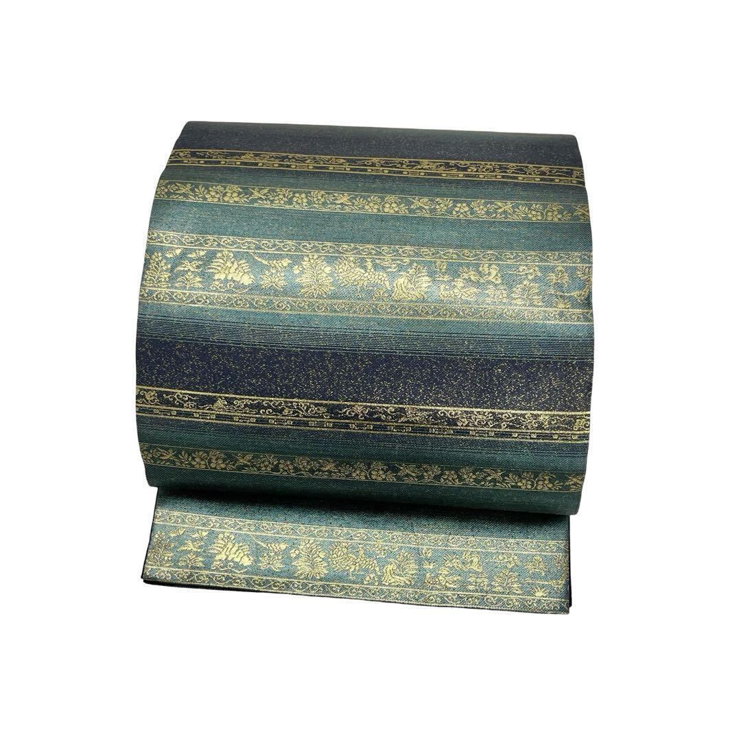 碧色ベースのお色味に金糸が使われた横段花草模様がデザインされた素敵な柄裄のお品でございます。