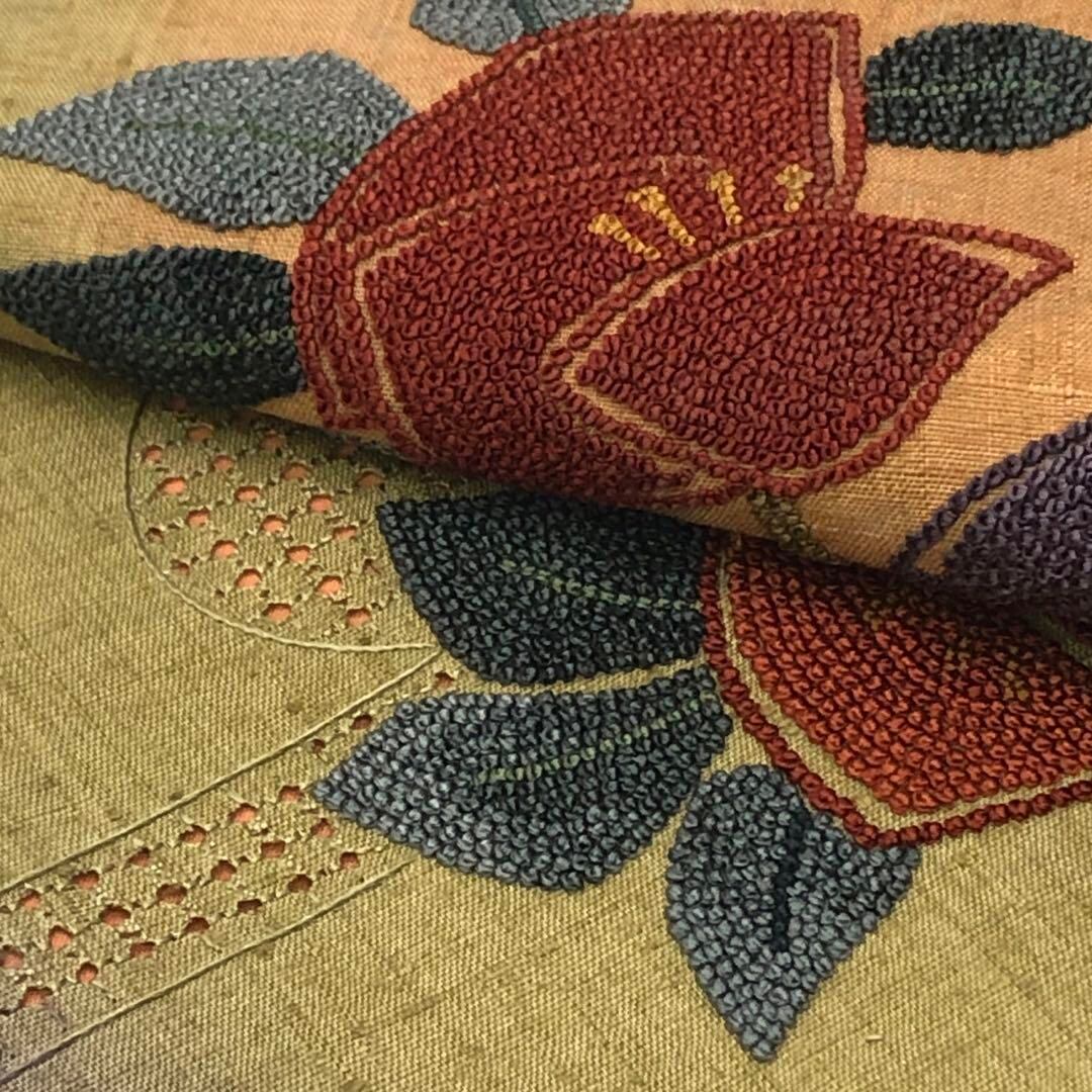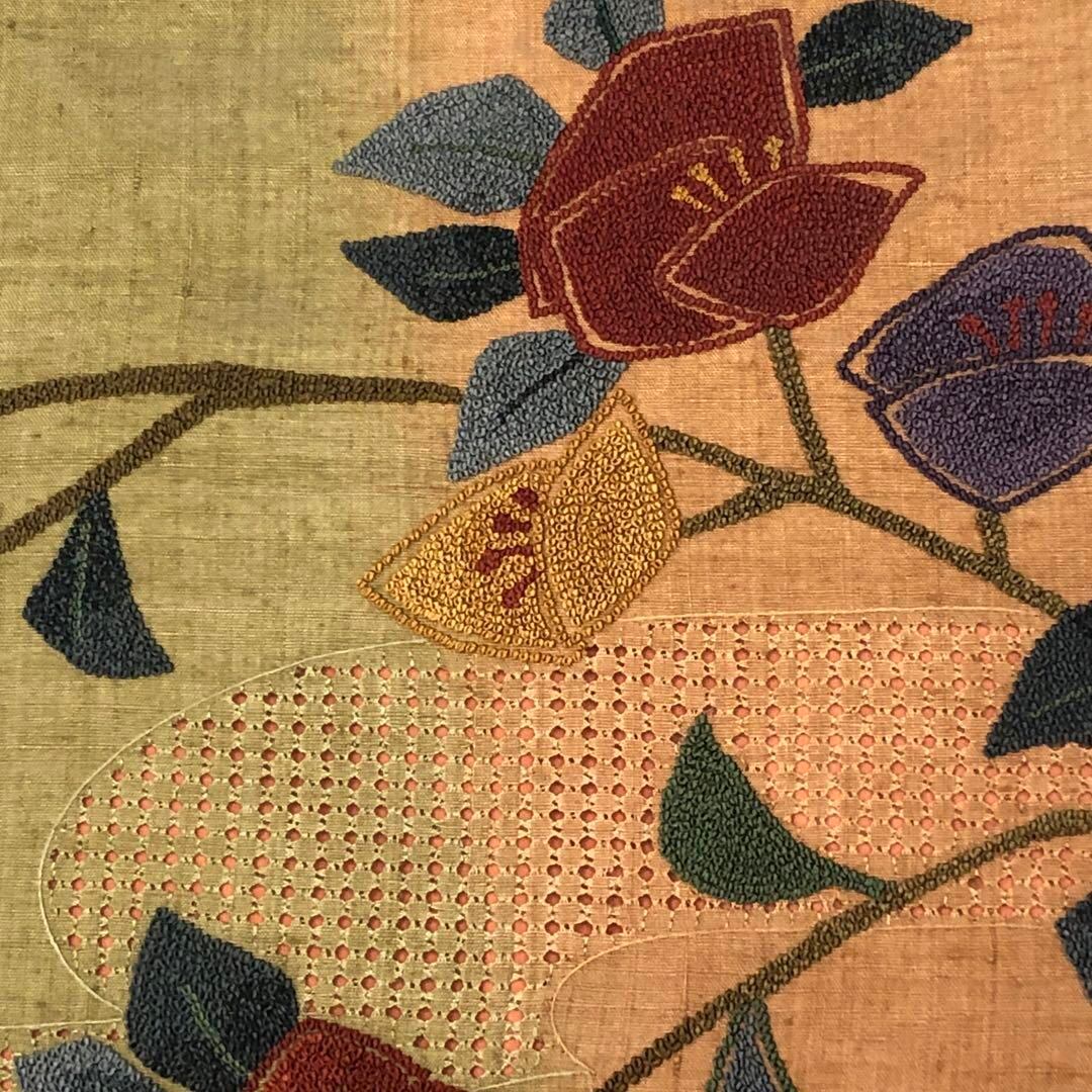 落ち着いたお色味の紬地に相良刺繍、汕頭刺繍の刺繍の花柄模様がデザインされた素敵なお品でございます。