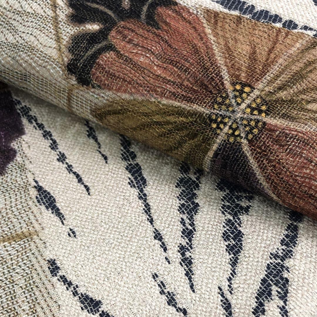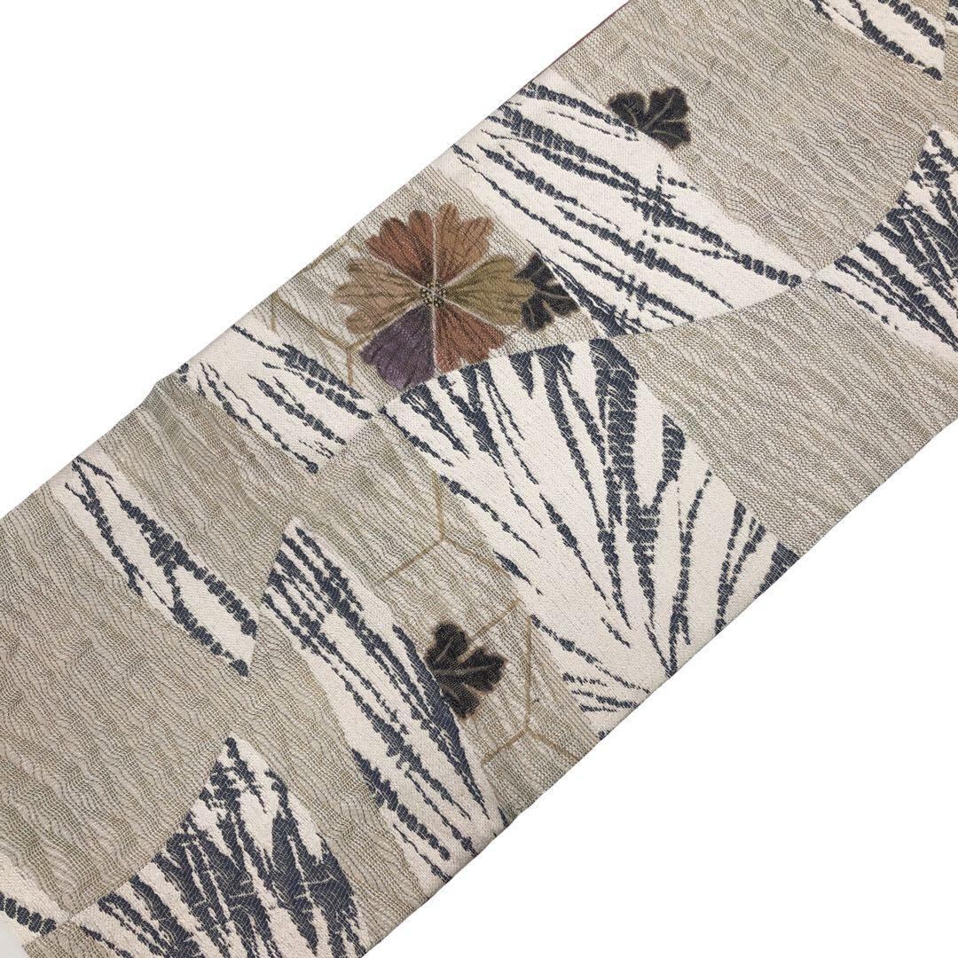乳白色ベースの柔らかい色彩、花模様、絞り風の織柄などがデザインされた雰囲気の良い素敵なお品でございます。